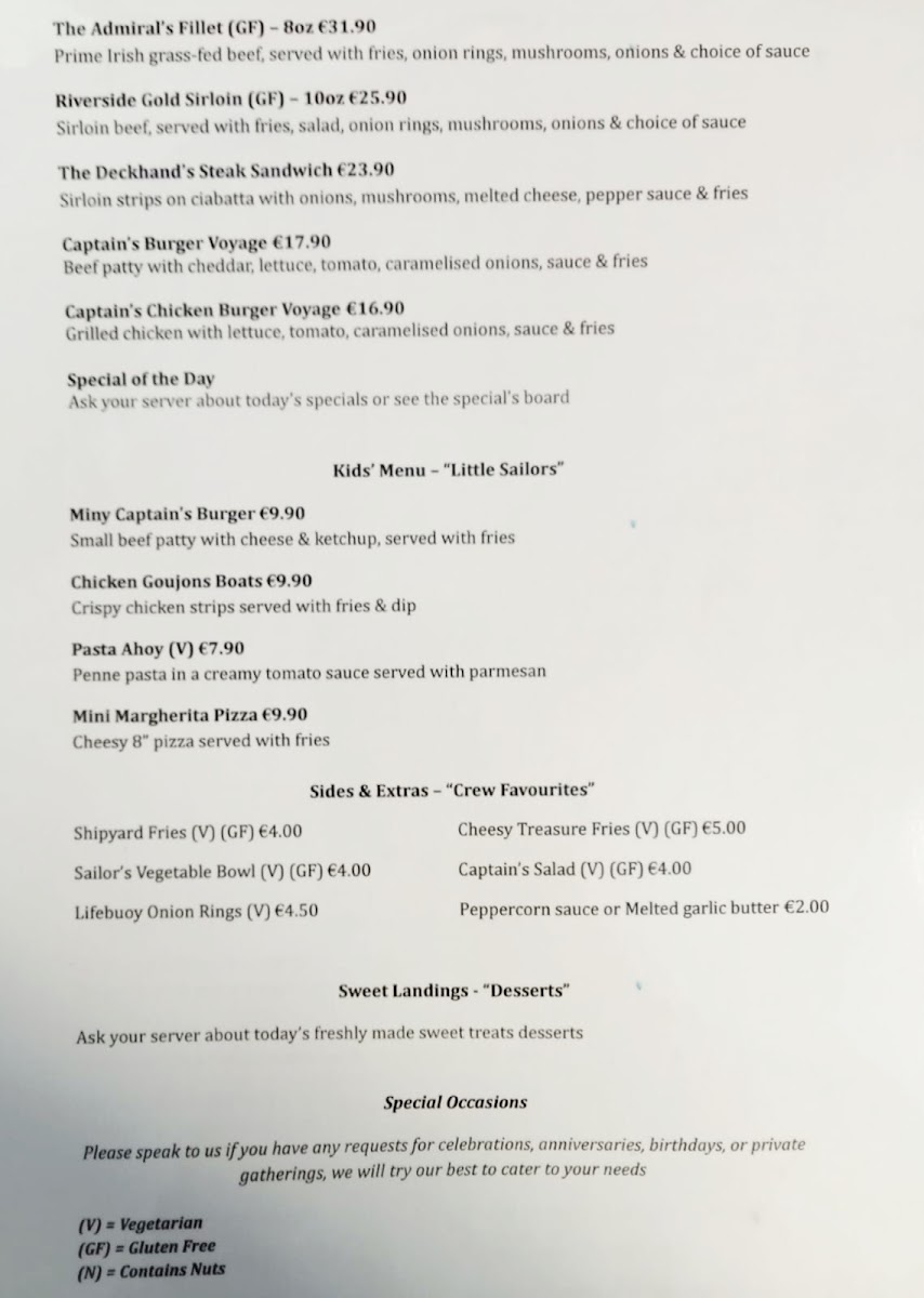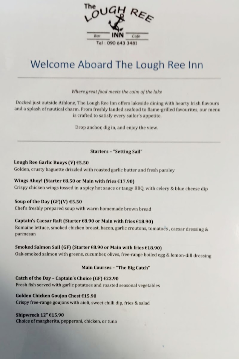 From a reviewer’s perspective, the menu at The Lough Ree Inn offers a nautical-themed selection of starters that feels both playful and inviting. Dishes like Lough Ree Garlic Bouys, Wings Ahoy Starter, and Soup of the Day provide familiar comfort options, while more distinctive choices such as Captain's Ceasar Raft Starter and Smoked Salmon Sail (Starter) add a touch of creativity and local character to the menu. Although the selection is focused and not overly large, the themed dish names give the menu personality and make the dining experience feel unique and memorable, suggesting a casual, welcoming spot that emphasizes hearty starters and classic flavors.
